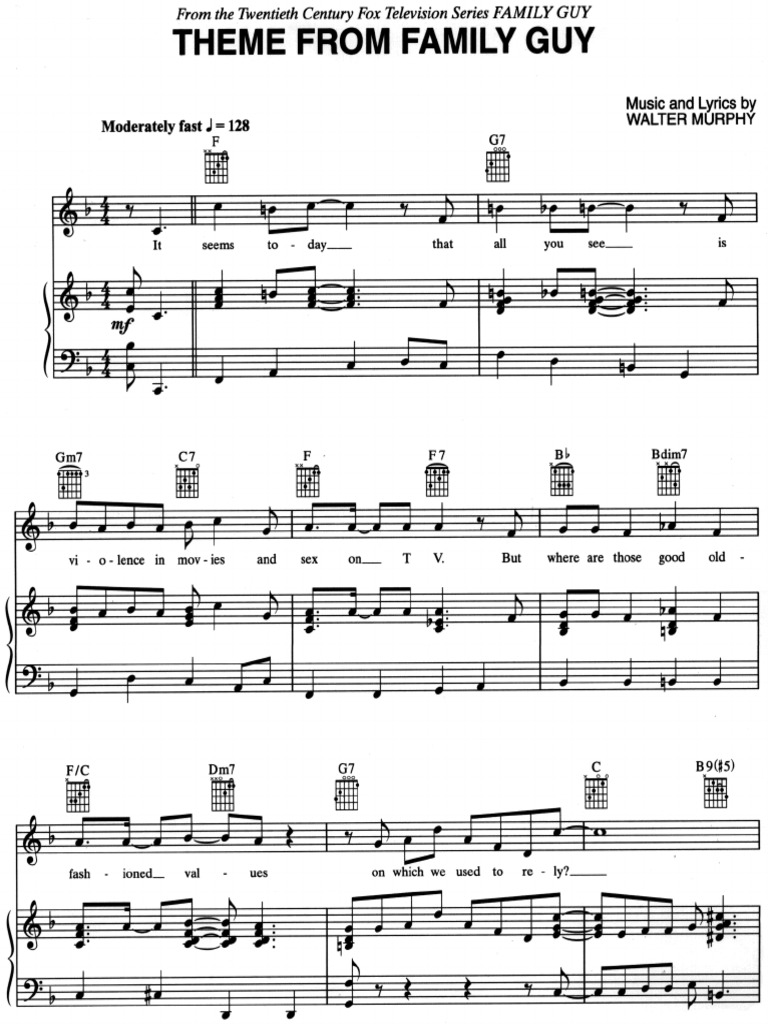 Family Guy Sheet Music Piano : Sheet music arranged for pianovocalguitar in f major transposable.